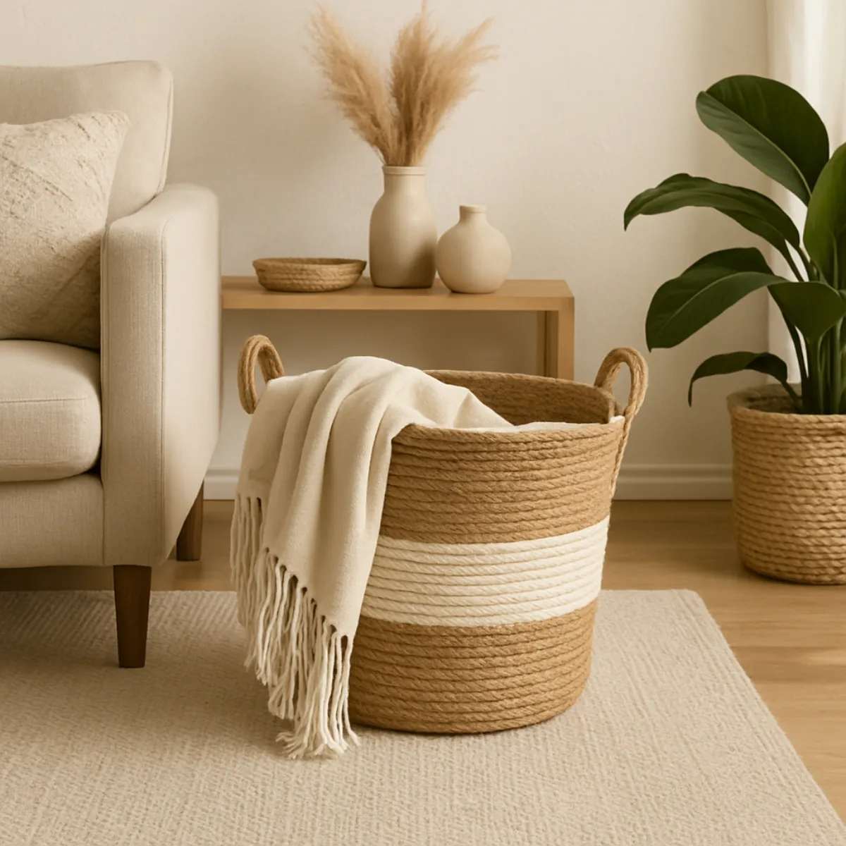 Organização também é decoração! Cestos de palha ou tecido ajudam a manter tudo em ordem com charme.